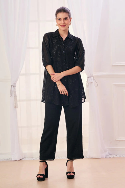 Black Silk Cotton Blend Embroidered Safari Collar Shirt And Pant Set